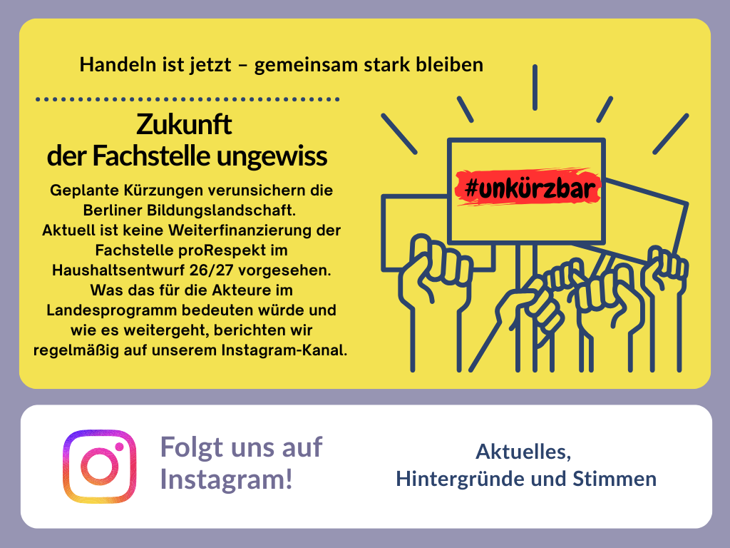 Mit großer Unsicherheit blicken wir auf die Verhandlung zum Berliner Haushalt 2026/2027. Vielfältige Programme und Träger leisten in Berlin einen wesentlichen Beitrag zur Demokratieförderung und Gewaltprävention, zur Qualitätsentwicklung im Ganztag und Sprachförderung geflüchteter Kinder und Jugendlicher, zur interkulturellen sowie inklusiven Bildung. Viele der über Jahre gewachsenen Bildungsangebote sind aktuell im Entwurf für den Doppelhaushalt nicht vorgesehen. Auch die Fachstelle proRespekt wird in der Auflistung enthaltener Teilansätze nicht benannt und müsste ohne Zuwendung zum Jahresende ihre Arbeit einstellen. Die Fachstelle proRespekt setzt im Trägerverbund seit sechs Jahren das Landesprogramm „proRespekt – gewaltfreie Schulen demokratisch gestalten“ um. Das Programm stärkt schulische Strukturen durch passgenaue Entwicklungsvorhaben zu Gewaltprävention, Demokratiebildung und Verringerung von Schuldistanz, unterstützt die Handlungsfähigkeit der pädagogischen Fachkräfte und fördert die multiprofessionelle Zusammenarbeit und sozialräumliche Kooperation, um eine sichere und von Anerkennung geprägte Lernumgebung für Kinder und Jugendliche zu schaffen. Ohne die Fachstelle proRespekt ist ein Qualitätsverlust des Landesprogrammes zu befürchten, da eine systematische Begleitung, Vernetzung und Qualifizierung des proRespekt-Landespersonals und der teilnehmenden Schulen nicht mehr gegeben wären. Auch würde das Aus der Fachstelle proRespekt die nachhaltigen Strukturen gefährden, die gemeinsam mit der Senatsverwaltung für Bildung, Jugend und Familie über Jahre aufgebaut wurden.